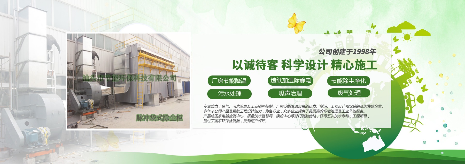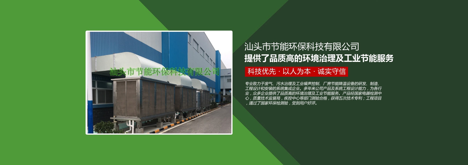 汕頭市節(jié)能環(huán)保科技有限公司創(chuàng)建于1998年,是一家專業(yè)致力于廢氣、污水、粉塵、噪聲治理,廠房節(jié)能降溫設備的研發(fā)、制造、工程設計和安裝的系統(tǒng)集成企業(yè)。多年來公司產(chǎn)品及系統(tǒng)工程設計能力,為各行業(yè),眾多企業(yè)提供了品質(zhì)高的環(huán)境治理及工業(yè)節(jié)能服務。產(chǎn)品經(jīng)國家電器檢測中心,質(zhì)量技術(shù)監(jiān)督局,疾控中心等部門測驗合格,獲得五次技術(shù)專利;工程項目通過了國家環(huán)保檢驗檢測,受到用戶好評。